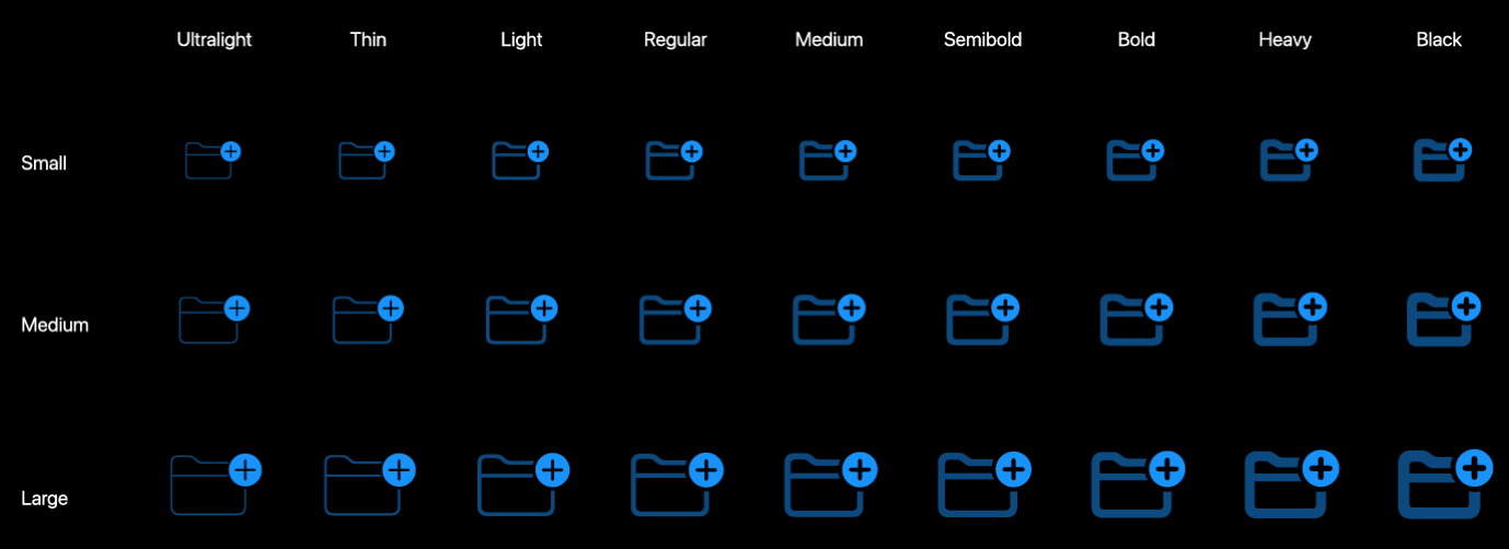 (3) SF Symbols는 9단계의 Weight(무게/두께?)와 3단계의 Scale(크기)를 제공, 총 27개의 결과물을 이용할 수 있다.