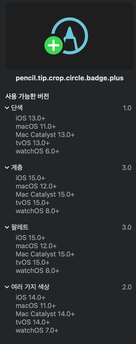 아래처럼 각 기호의 렌더링 모드 및 기능들이 제대로 나타날 수 있는 플랫폼 버전들도 파악 가능하다. (feat. SF Symbols App 화면)